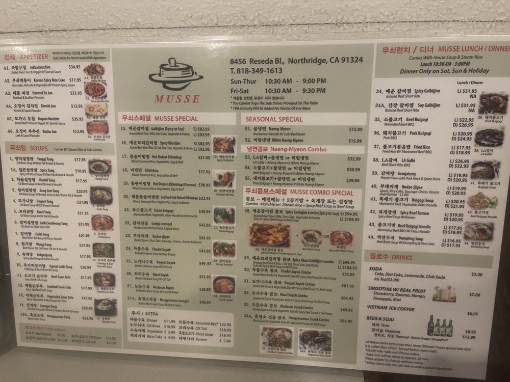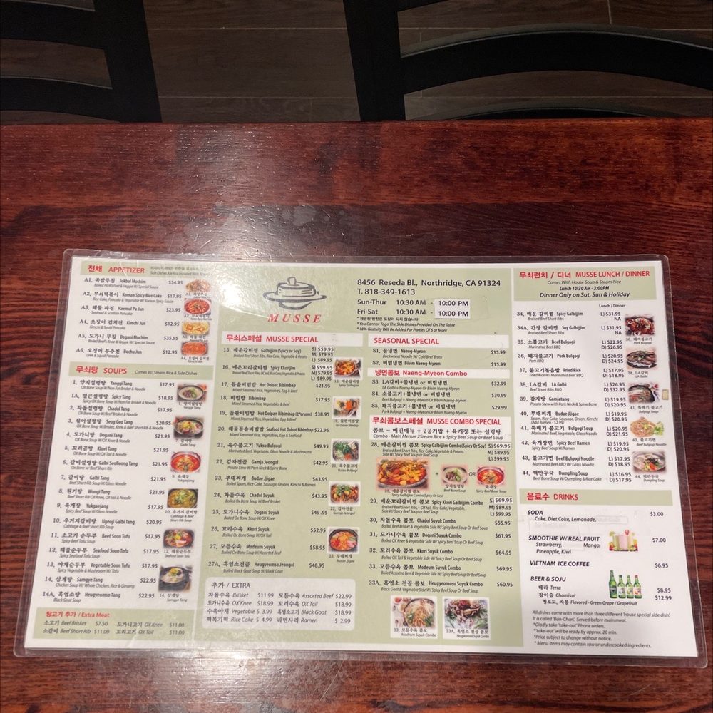MUSSE is a Korean restaurant located in Los Angeles, CA, offering a wide range of authentic Korean dishes. The menu includes traditional dinner mains like Beef Bulgogi and Pork Bulgogi, along with delicious appetizers such as Jokbal Muchim and Haemul Pa Jun. The soups, like Yanggi Soup and Chadol Soup, are flavorful and satisfying. Customers have praised the cozy atmosphere and attentive service at MUSSE. One reviewer especially enjoyed the Bone Broth Tendon and Cartilage soup, highlighting the rich broth and flavorful side dishes. Whether you're craving comforting soups or flavorful BBQ dishes, MUSSE is a must-visit spot for Korean cuisine enthusiasts. The restaurant also provides delivery, takeout, and catering options, making it convenient for customers to enjoy their favorite dishes at home.